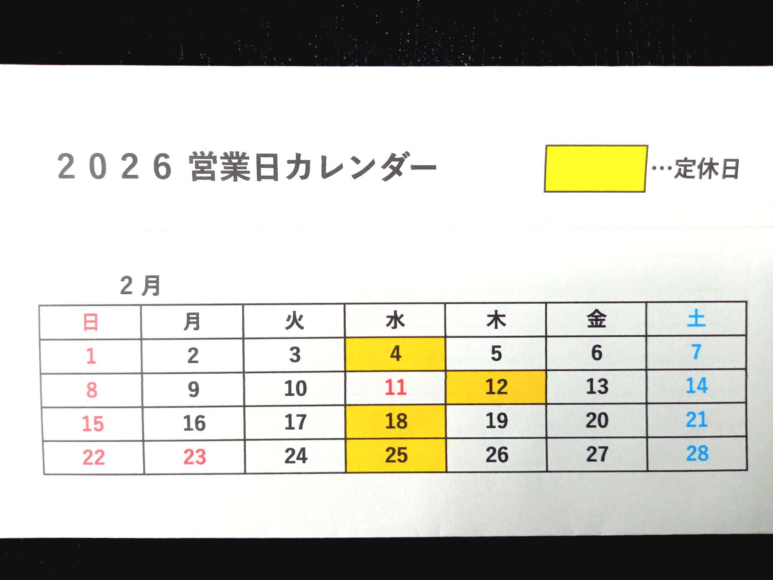 2月の『営業日』及び『定休日』をお知らせいたします。